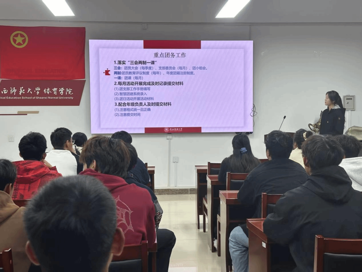 为进一步规范团支部建设,提升团支书工作能力,明确团务工作要求,9月21日,陕西师范大学体育学院召开团支书工作例会,学院团委书记张媚、全体团支书共同参加此次会议。