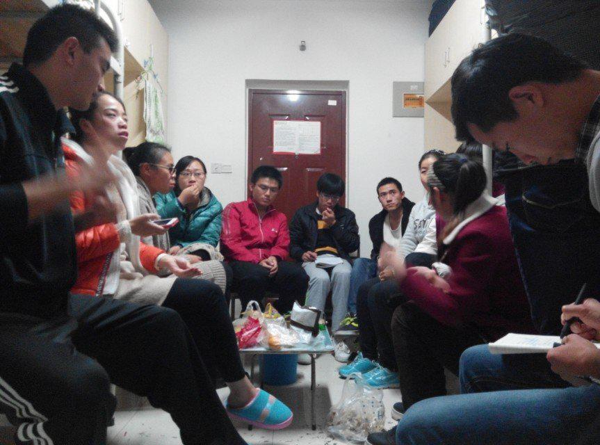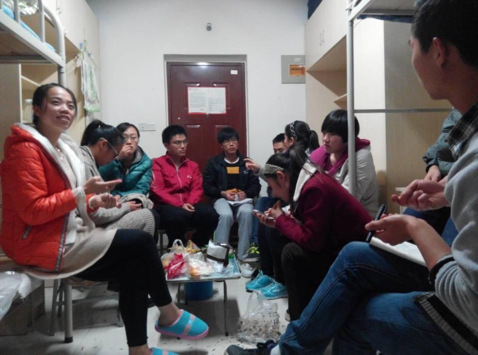 2014年11月13日晚7点,陕师大硕士楼1412宿舍里坐满了2014级体育教育训练学专业的研究生,宿舍中间一张简易电脑桌子上放满了同学们自己带来的桔子、红枣、瓜子等零食,一位同学手拿稿纸站在最里面宣读着会议内容,另外,有的同学全神贯注地听着,有的不停地挥舞着手中的笔疯狂地做记录,有的用手机咔咔地拍着照片,其余的同学若有所思、若有所悟......