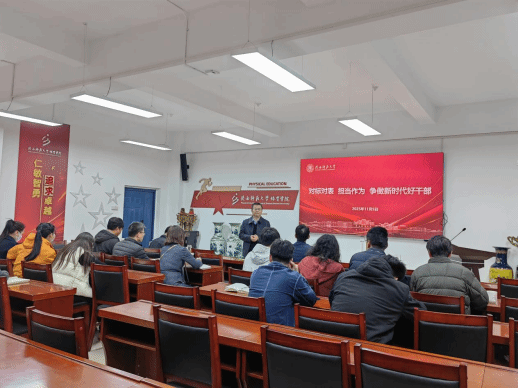 11月5日下午,体育学院行政能力提升培训班第二期在文津楼3125会议室举行。学院邀请学校党委组织部副部长胡智勇作“对标对表,担当作为,争做新时代好干部”主题报告,学院领导班子及党政办、学工组、实验办等全体教师参会,会议由学院党委书记胡波主持。