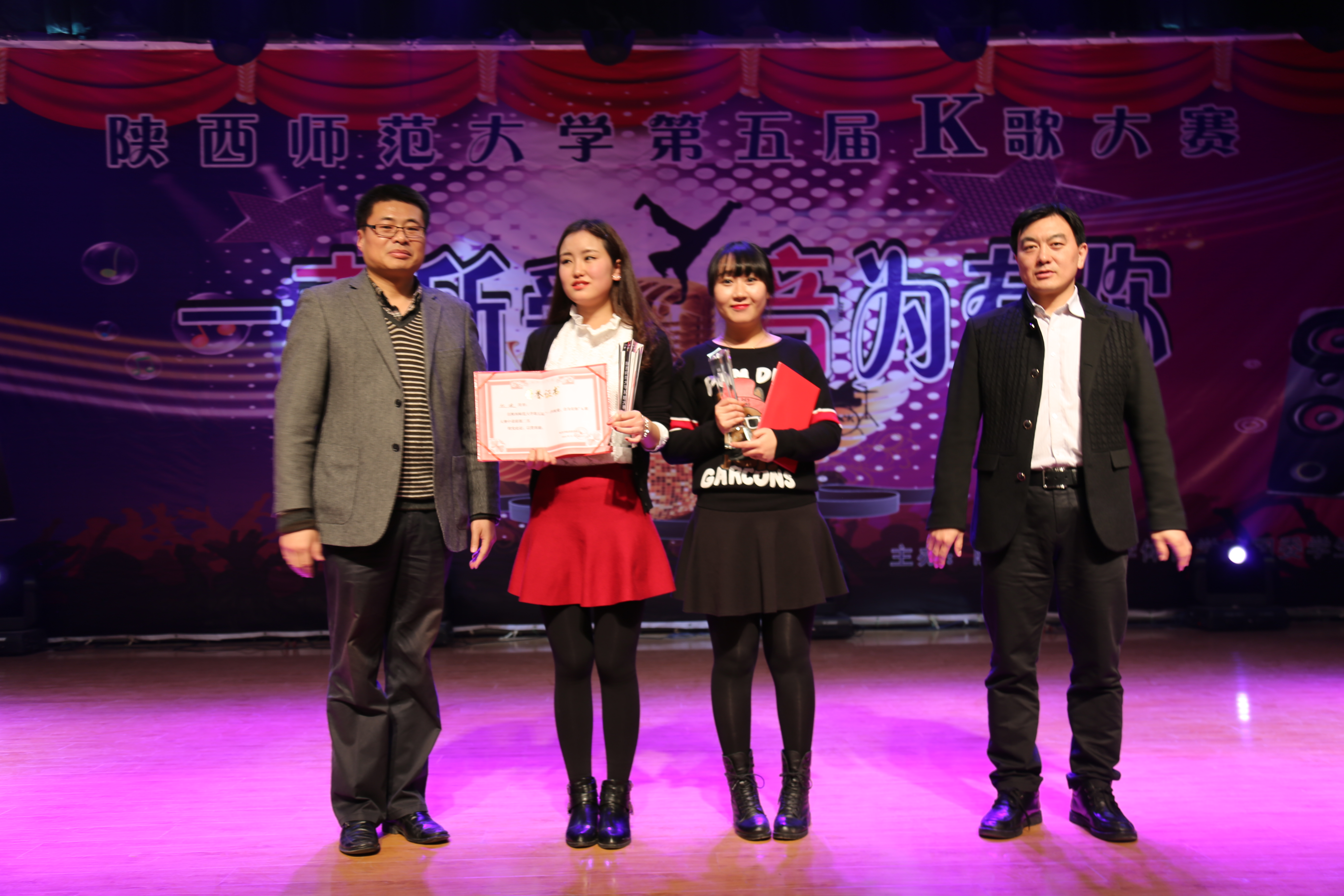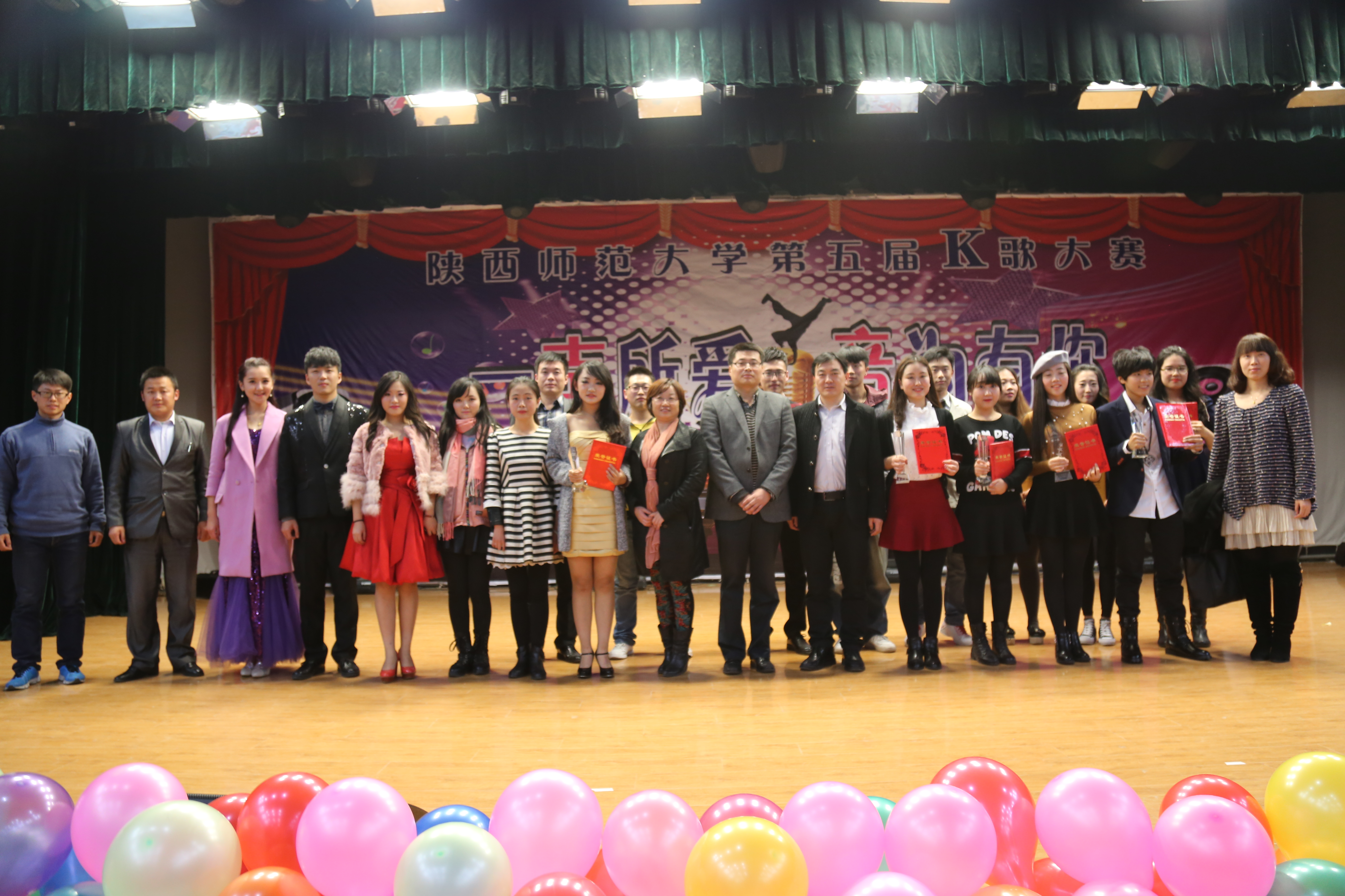 最后,由校团委副书记祁斌业老师、体育学院党委书记王海彬老师、党委副书记朱海荣老师、体育学院辅导员李钊老师、党琳琳老师、樊岫珊老师为获奖选手颁发奖状与奖杯并合影留念。持续了两个多小时的比赛后主持人宣布比赛圆满结束。陕西师范大学第五届k歌大赛“一声所爱,音为有你”圆满落幕。